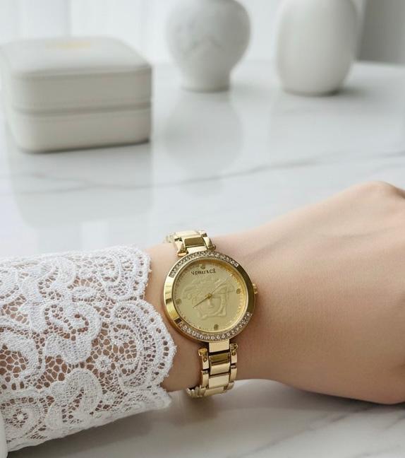ساعة ذهبية فاخرة تجذب الأنظار من اللحظة الأولى. تصميمها الرفيع، ميناها اللامع، وسوارها المتقن يمنحونها هالة من الرقي تناسب الذوق الرفيع والشخصية الراقية.